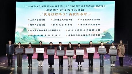近日,2025齐鲁文化情景阅读创意大赛、山东省青少年成语经典故事会颁奖典礼暨优秀作品展演在山东省话剧院大剧场隆重举行。我校图书馆因在赛事组织工作中的突出表现,被授予“优秀组织单位”荣誉称号。