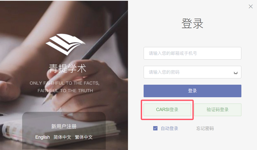 1.打开青提学术,点击用户界面最下方的“CARSI登录”按钮。